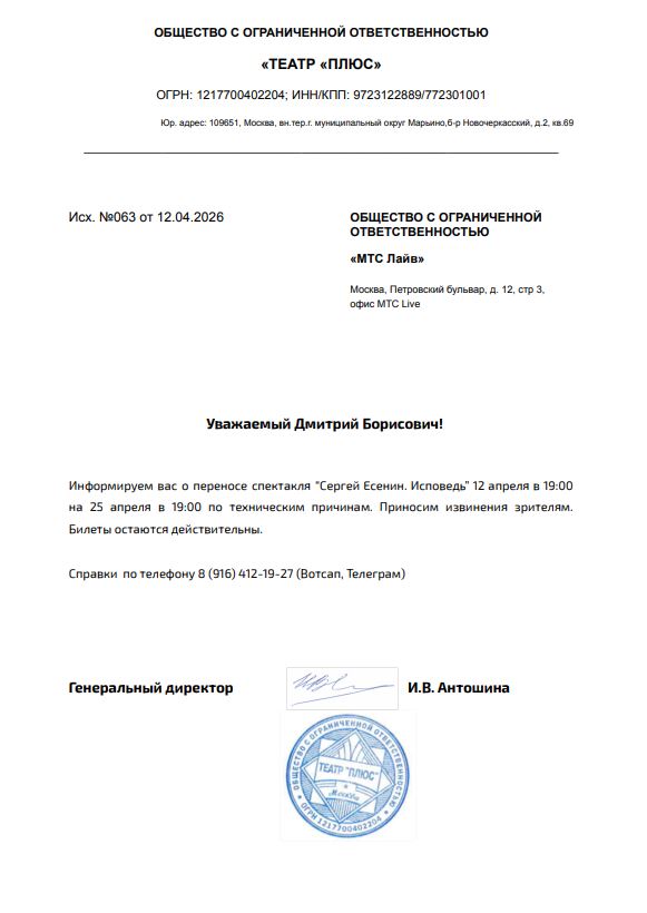 Спешим сообщить, что по информации, полученной от организатора, спектакль «Сергей Есенин. Исповедь», запланированный на 12 апреля 2026 года в 18:00 в Театре «Точка Ру», переносится на 25 апреля 2026 года, начало в 19:00.