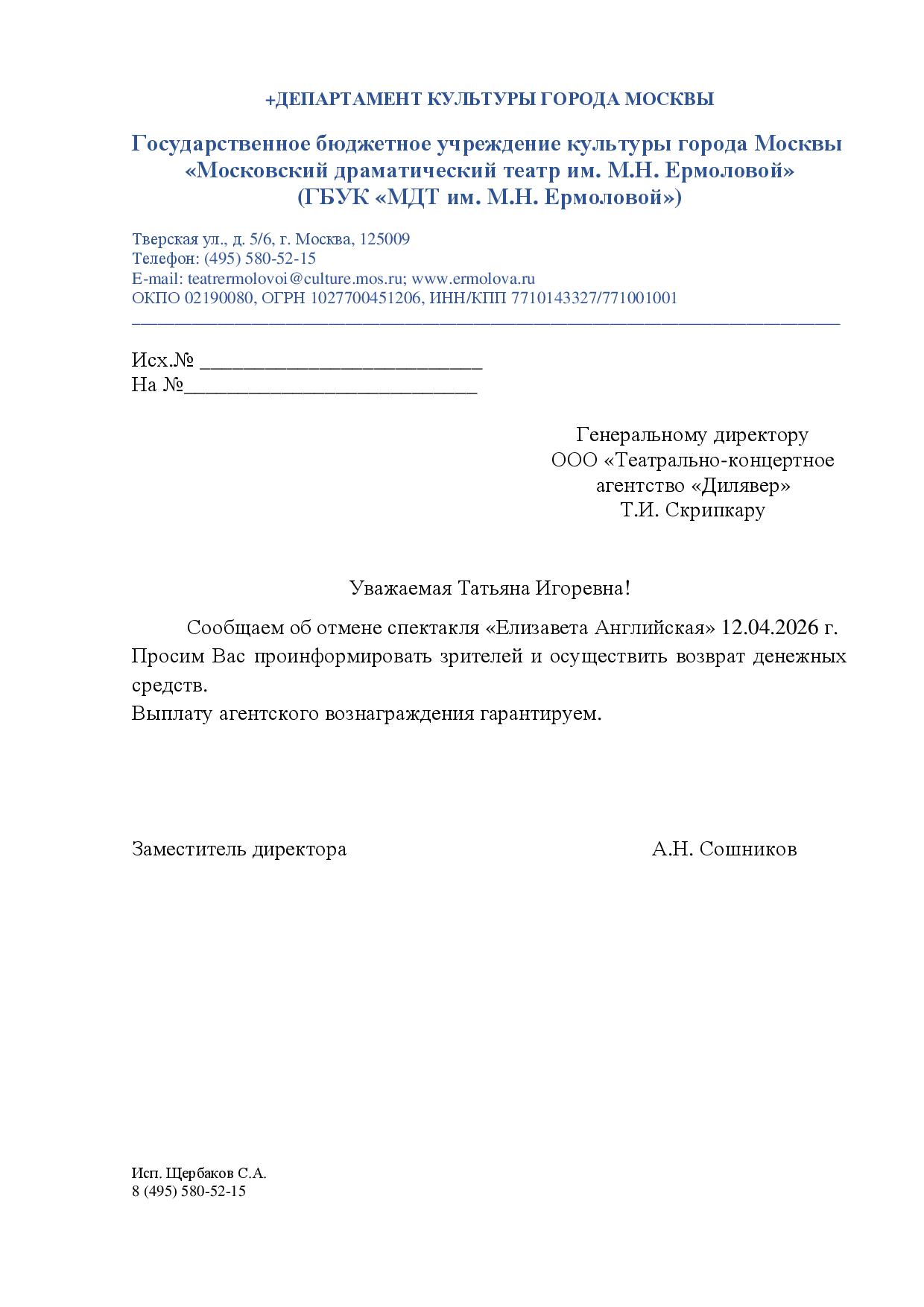 Спешим сообщить, что по информации, полученной от организатора, спектакль-премьера «Елизавета Английская», запланированный на 12 апреля 2026 года в 19:00 в театре имени Ермоловой, отменён.